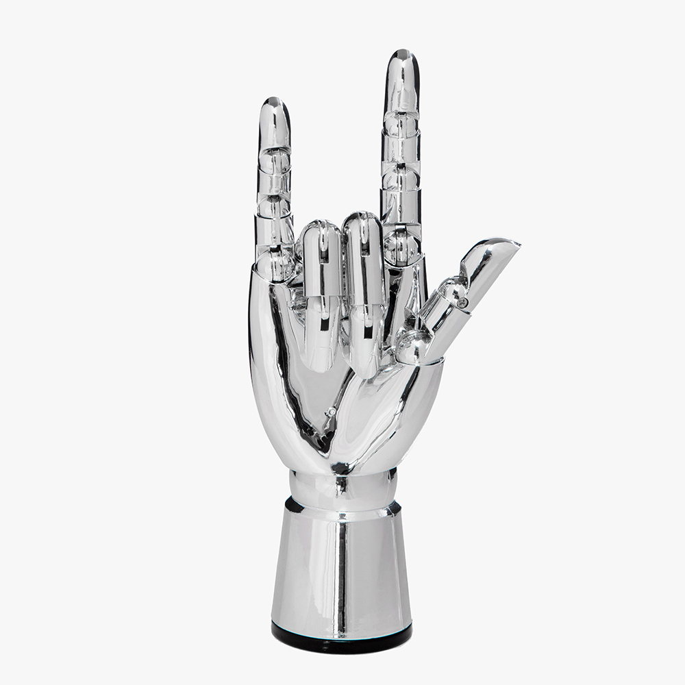 Our new ABS material electroplated silver hand, 23.5cm long, 14cm thick wrist, with adjustable height metal pole base. You can use it to display jewelry. There are styles for both left and right hands. I believe it can meet your various jewelry display needs.
