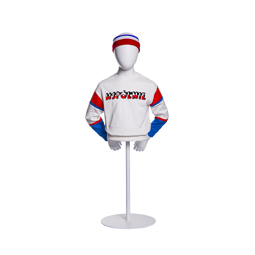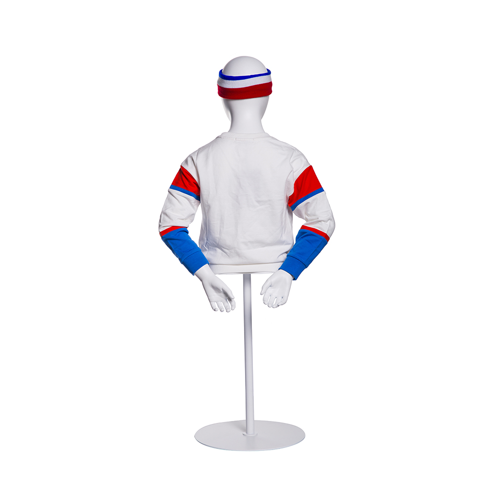 This upper body child young boy mannequin comes in matte white, we can also make it in glossy white or some others color if you like. Its metal base makes it stable on the ground, of course, we can provide glass base.
